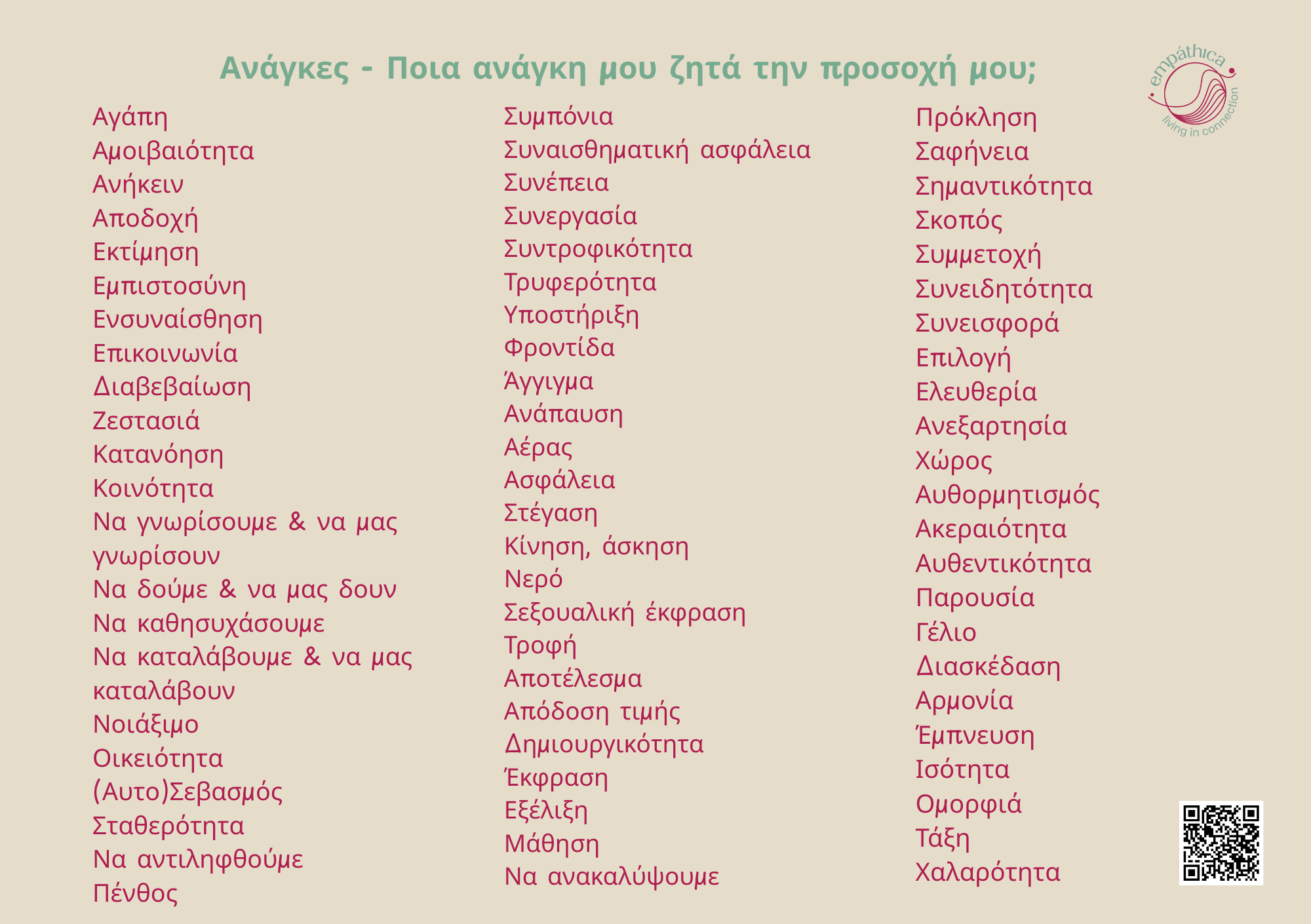 Εδώ μπορείτε να δείτε και να κατεβάσετε μια ενδεικτική λίστα ευχάριστων και δυσάρεστων συναισθημάτων-σωματικών αισθήσεων, καθώς και μια λίστα με ανάγκες.